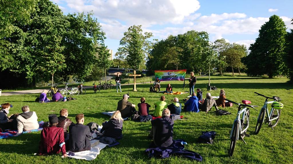 Am vergangenen Freitag kamen einige queere Gläubige zusammen um an einem eher ungewöhnlichen Ort Gottesdienst zu feiern. Kimm Herlyn von der evangelischen Kirche, Karsten Weidisch von der römisch-katholischen Kirche und Klara Robbers von der alt-katholischen Kirche leiteten den Gottesdienst am Aasee. Musikalisch gestalteten Kimm, Jan und Anja das bunte Fest. Thematisch ging es in dem Gottesdienst um die Szene, wo sich Jesus und seine Jünger ans andere Ufer aufgemacht haben und durch stürmisches Wasser fuhren. Im Anschluss an den Gottesdienst blieben alle zusammen zum gemeinsamen Picknicken.