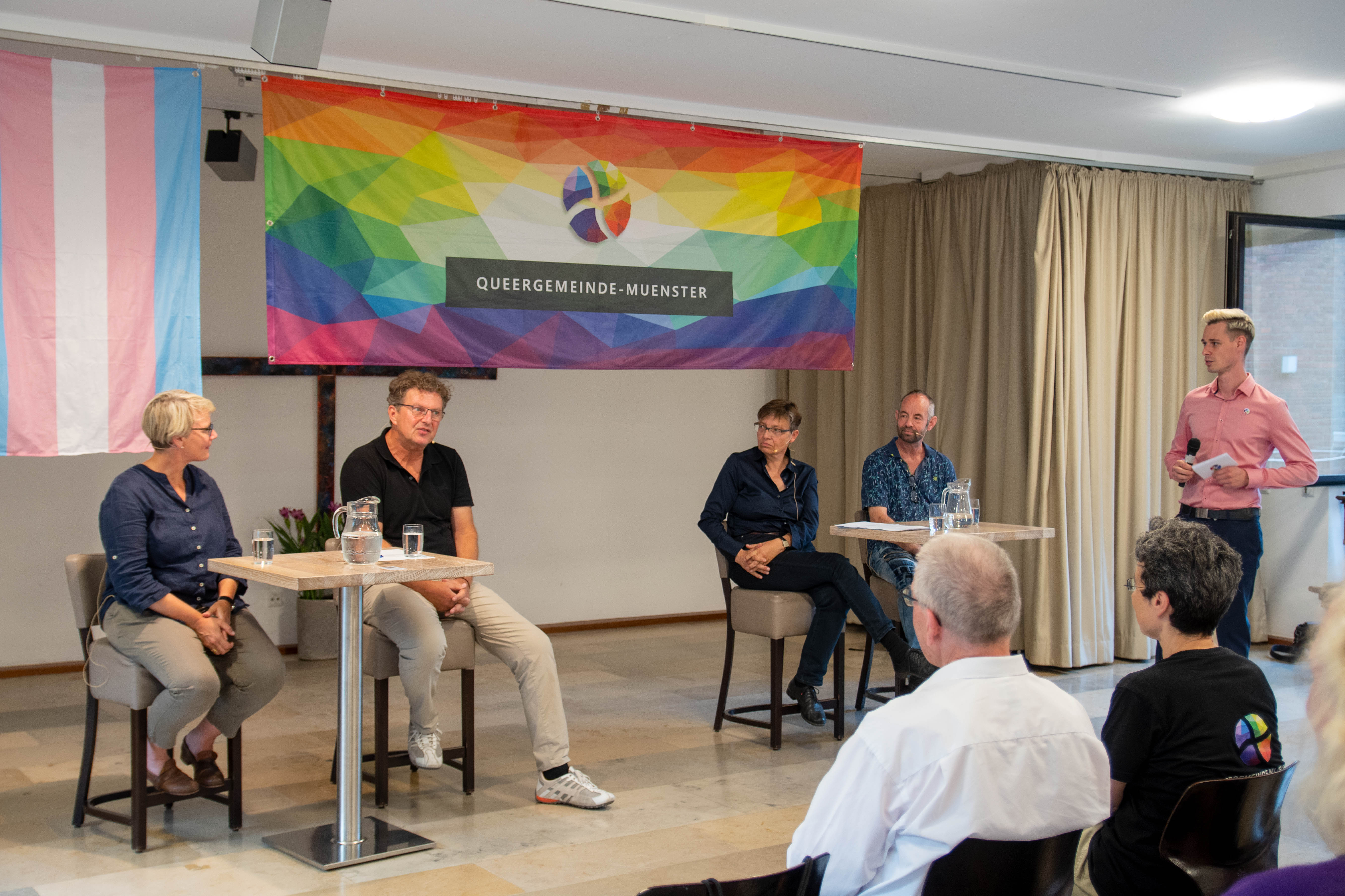 Im Rahmen der Münsteraner Pride Weeks 2022 hatte die Queergemeinde Münster zu einer Podiumsdiskussion am 17. August 2022 ins Pfarrheim der Gemeinde St. Josef Münster-Süd eingeladen, bei der unter dem Motto „Zwischen zwei Stühlen – Gott kann mehr als nur binär!“ die Haltung der römisch-katholischen Kirche zur Transgeschlechtlichkeit und zu transidenten Menschen kritisch beleuchtet wurde. Die Veranstaltung wurde sogar per Live-Stream des Bistums Münster übertragen und war bereits zuvor über eine Vielzahl an Medien angekündigt worden. So konnte dann auch eine erfreulich hohe Besucherzahl verzeichnet werden.