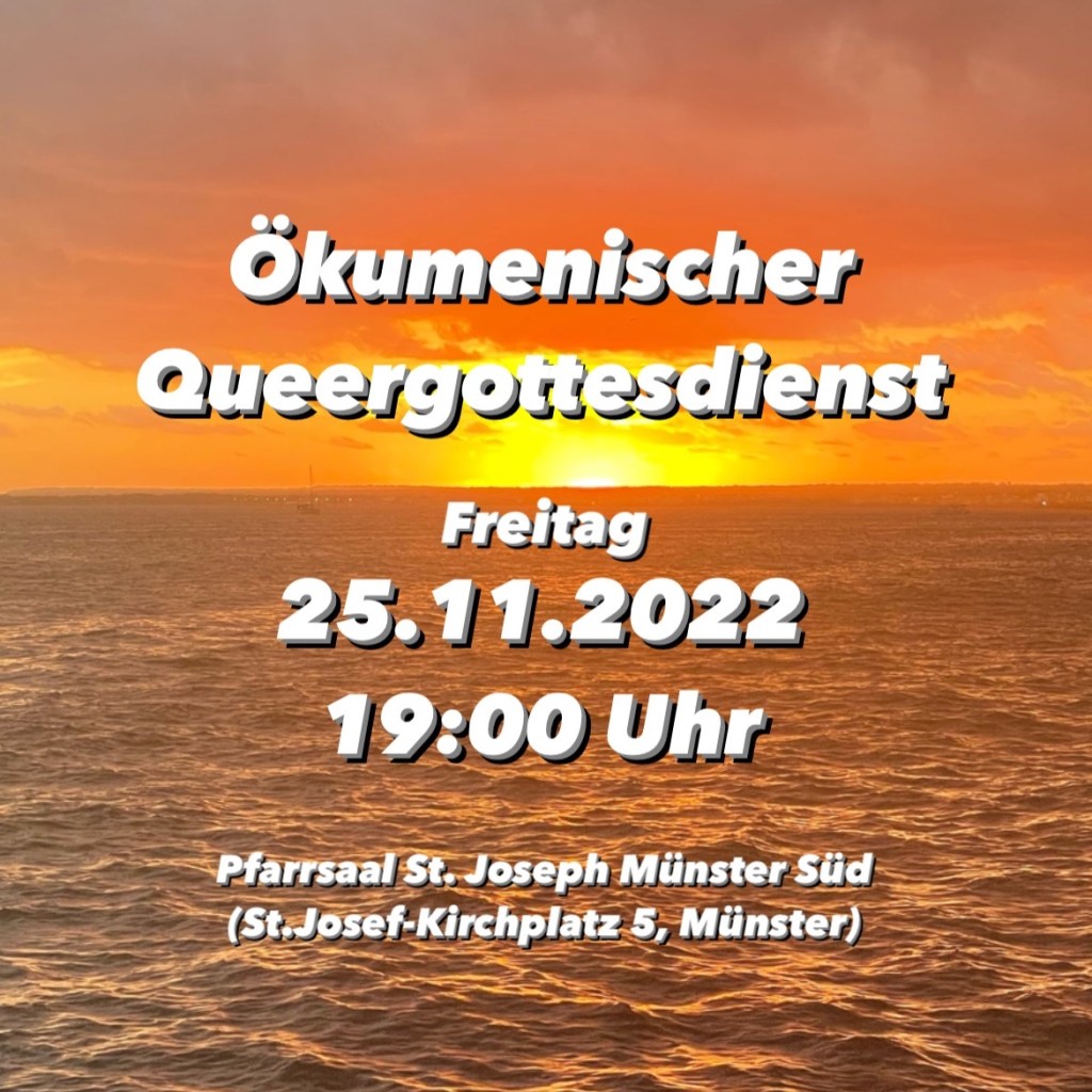 Herzliche Einladung zum ökumenischen Queergottesdienst. Als Ergänzung zum all monatlichen Queergottesdienst, den wir in römisch-katholischem Ritus feiern, hat die Queergemeinde eine ökumenische Reihe ins Leben gerufen, die quartalsweise stattfinden. Diese finden eher an ungewöhnlichen, queeren Orten statt. Unser letzter ökumenischer Gottesdienst war am Aasee auf Picknick-Decken ein voller Erfolg. Gemeinsam mit evangelischen, alt-katholischen und römisch-katholischen Queers wollen wir diese Reihe weiterführen mit einem Gottesdienst Ende November. Dieser findet im Pfarrsaal von St. Joseph statt und wird sicherlich auch überraschend anders sein. Also wenn du Queer oder queerfreundlich hetero bist, bist du herzlich eingeladen. Im Anschluss gibt es einen kleinen Umtrunk.