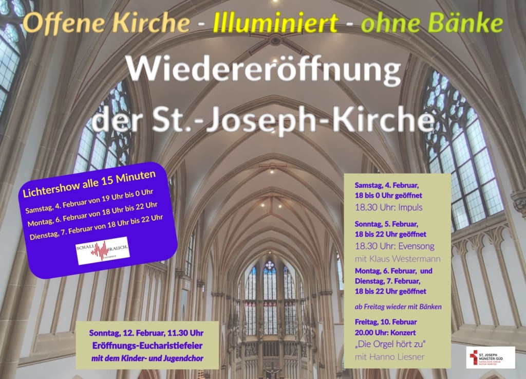 Herauszuheben ist hierbei sicherlich eine Lichtershow, die an dem Samstag (4.02.2023) und dem Montag (6.02.) und Dienstag (7.02.) in der besagten Wochen stattfinden wird. Frei von Bänken erstrahlt der Kirchraum in bunten Farben. Lieder, die man nicht in einer Kirche vermuten würde, laden die ein oder den anderen vielleicht sogar zum Tanzen ein. Begleitet werden die Lieder von Lasern, LED-Spots und einiger Nebelmaschinen.