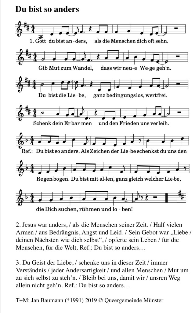 Lied der Queergemeide 28. Oktober 2025 / jDiek Zur Verwendung in Gottesdiensten freigegeben. Rechte liegen beim Komponisten und der Queergemeide Münster. Bitte immer ausweisen. Teilen mit: Klicke, um auf X zu teilen (Wird in neuem Fenster geöffnet) X Klick, um auf Facebook zu teilen (Wird in neuem Fenster geöffnet) Facebook