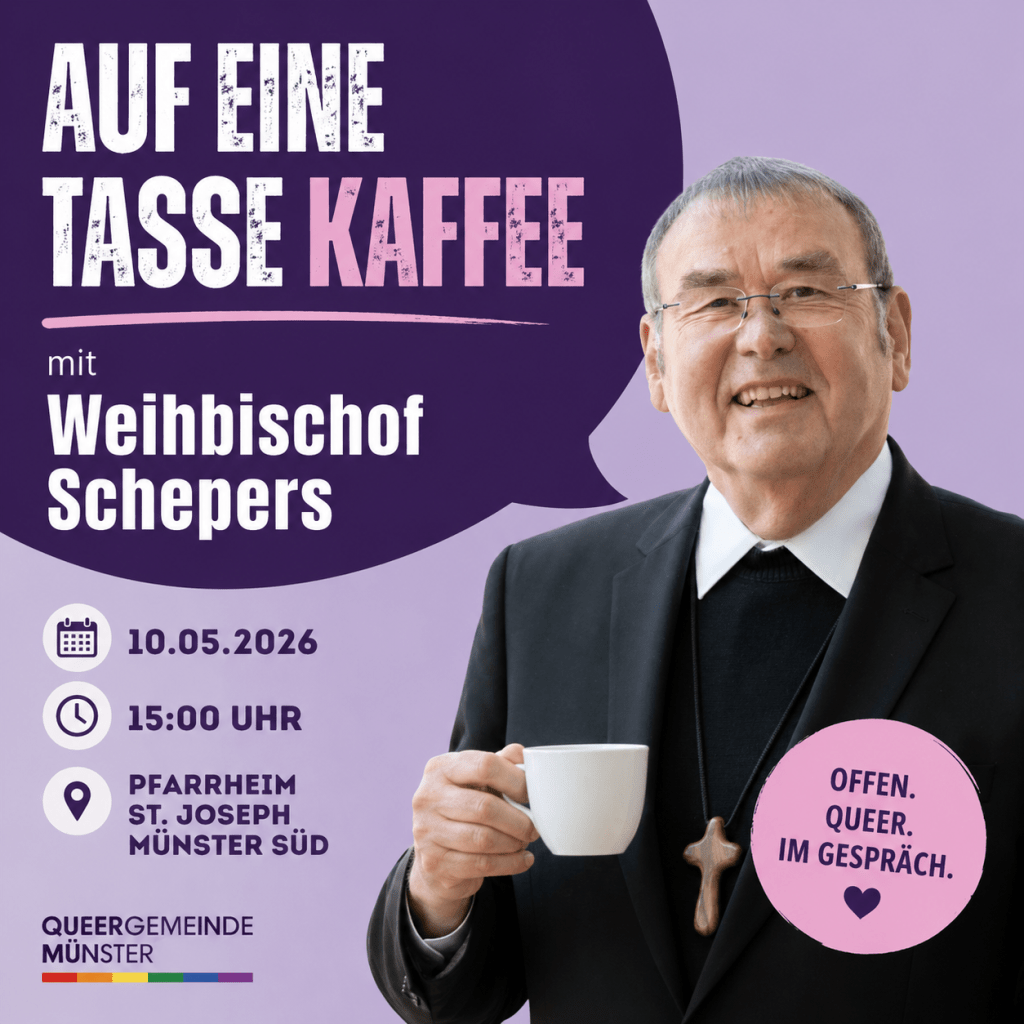 Am 10. Mai 2026 um 15:00 Uhr lädt die Queergemeinde Münster zu einer besonderen Begegnung ein: Unter dem Titel „Auf eine Tasse Kaffee – mit Weihbischof Schepers“ entsteht im Pfarrheim St. Joseph Münster Süd ein Raum für offenen Austausch, ehrliche Fragen und respektvolle Gespräche.